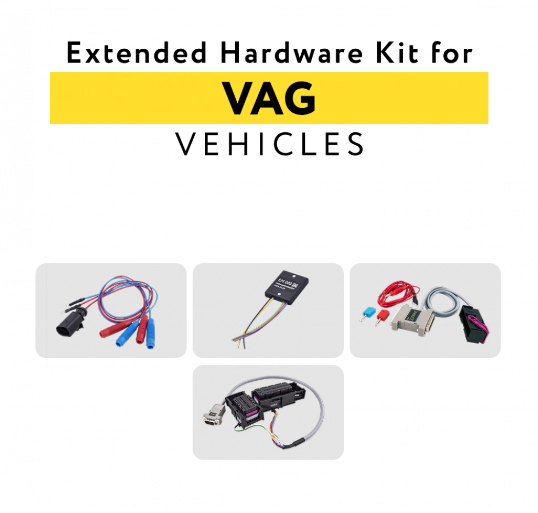 Ce pack contient du matériel Abrites supplémentaire pour travailler avec les véhicules VAG, tels que des adaptateurs, des câbles et des émulateurs.